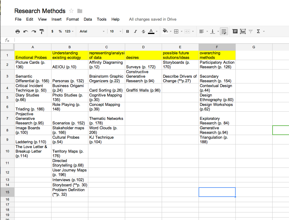 Today we finished up going through a few books of design research methods, for our research method analysis. We are looking at and analyzing the existing methods in an effort to understand what methods or combination of methods would be most useful for our project.