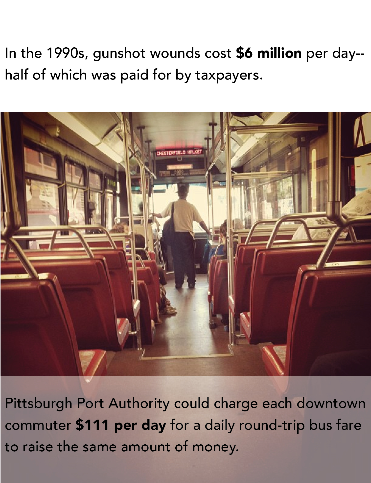 The statistic that has really stuck with me from the beginning of the semester is “In the 1990s, gunshot wounds cost $6 million per day– half of which was paid by taxpayers.” The goal of this quick exercise was to bring this ominous number of $3 million into something much more relatable, especially for Pittsburghers. Over 25,000 people commute into downtown Pittsburgh for work every day (source: FindTheData), and more people travel using the buses on a regular basis. Many residents became outraged when the Port Authority raised the bus fare to $2.50 one-way, so I prompt people to imagine paying $111 just to commute downtown and back. So much money is going towards gunshot wounds, many of which are unintended shootings and completely preventable. By giving people this comparison, hopefully they begin to understand simply how much money is wrapped up in the issue of accidental shootings.